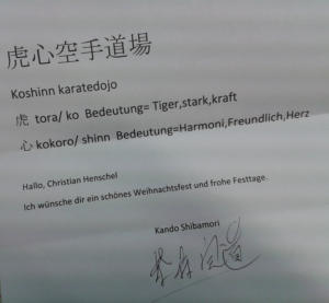 -11.01.2016Budônord Honbu Dôjô ist jetzt Koshinn Karate Dôjô….Unserem Karatverein ist nach knapp sieben Jahren eine sehr große Ehre zuteil geworden. Wir sind sehr stolz darauf ab Januar 2016 einen neuen Namen tragen zu dürfen. Genau zu Weihnachten hat uns das Anschreiben aus Linz ereilt und somit für das schönste Geschenk gesorgt. Verliehen wurde der Name uns von dem WUKF Welt Experten Shihan Kando Shibamori 9. Dan und ist ein persönliches Geschenk an Christian Henschel. Er spiegelt dessen Trainingseinsatz wieder und somit auch den Charakter des Dôjô.Der Name ist aus zwei Silben gebildet:Die erste Silbe TORA/KO bedeutet Tiger, stark, kraft. Die Zweite KOKORA/SHINN steht für Harmonie, freundlich und Herz.Wir nehmen die damit verbundene Bürde gerne auf uns und KOSHINN soll zu unserem Credo werden. Auch in Zukunft werden wir alles daran setzen das wir und kommende Schüler dem Namen gerecht werden und bleiben.